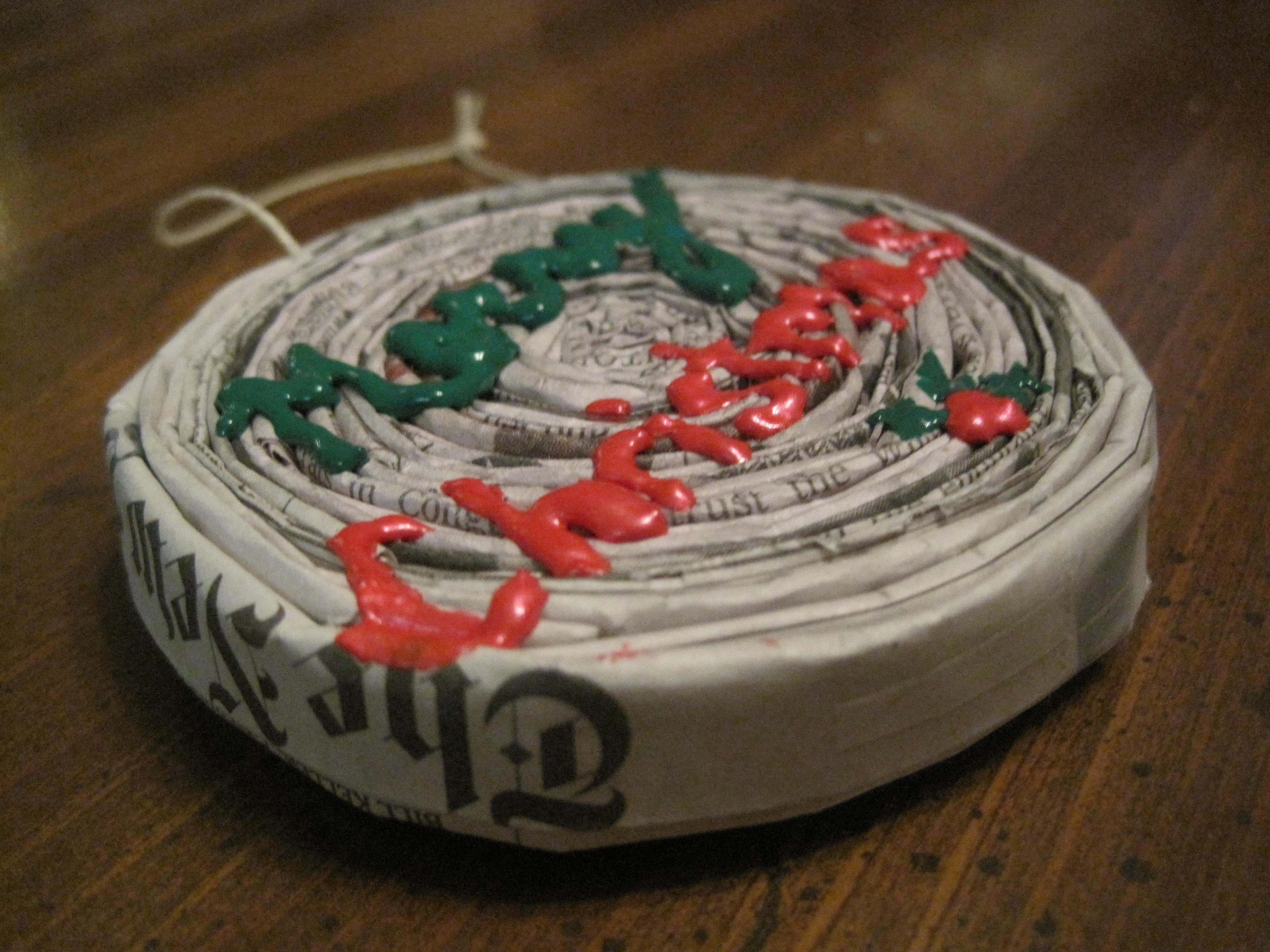 Whenever I see recycled items in gift shops, I think, “Oh, well I can do that.” But then I never do. I’ve seen coasters made from newspapers, wallets made from magazines and tote bags made from gum wrappers. After seeing some newspaper potholders in Ten Thousand Villages, I decided to make one out of the Op-Ed section of The New York Times. (Check out this clock and candy dish from TTV.) It’s a lot harder than I thought. I settled for this ornament for my grandma. I took some fabric paint and decorated it a little. Nevermind the smeared “C.” People make mistakes, ok?!