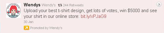 Once people have designed the T-shirts, others can vote on them. The design with the most votes wins. This is a clever tactic by any company for two reasons. 1) Although they are still paying the winner like they would with a professional designer, Wendy’s receives numerous options. To date, the contest has gotten 9,467 submissions. 2) The people decide the design. This is extremely important because these people are the ones who are going to buy this T-shirt. With guaranteed sales, Wendy’s will have no problem paying the grand prize, the cost of the T-shirts and make a lot of money for its charity.